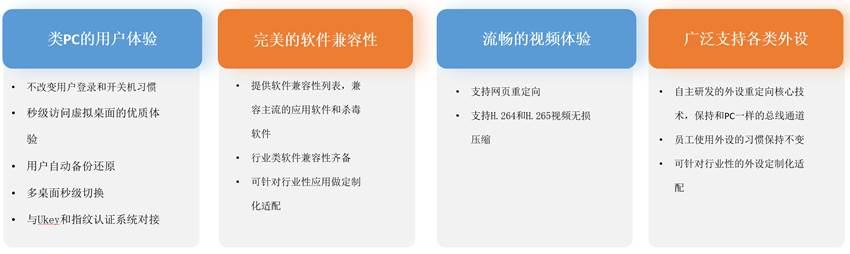 不改变用户的登陆、开机和关机习惯。桌面连接协议VDP针对桌面图像传输进行深度优化,大幅提升桌面访问体验,可实现桌面秒级登陆。