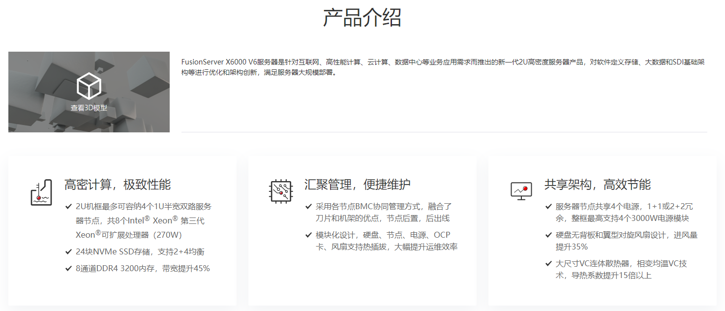 — | FusionServer X6000 V6机箱 | 支持4个1U半宽双路节点 | — | 24*2.5ʺ; 24*NVMe | 查看详情 |