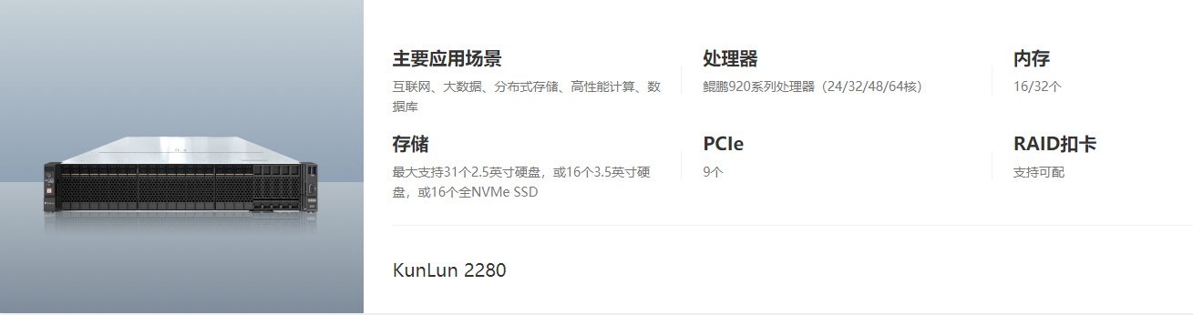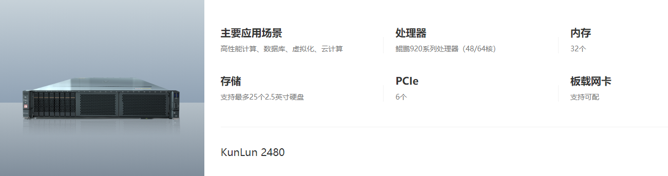 支持2颗鲲鹏920系列处理器(24/32/48/64核),CPU主频2.5GHz/2.6GHz/3.0GHz